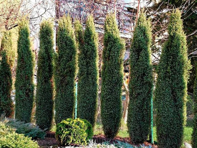 Можжевельник обыкновенный Арнольд Это один из наиболее распространённых сортов хвойных культур. Ареал его довольно большой. Это практически сплошная полоса, проходящая через северное полушарие. По древним поверьям можжевельником обыкновенным Арнольд спасались от удара молнией. Веточку растения держали почти в каждом доме. Сегодня эта культура активно используется в озеленении частных и городских территорий. Ботаническое описание По внешнему виду это небольшой, медленнорастущий кустарник. Крона у него компактных размеров, колонновидная и узкая. В высоту саженцы достигают около 1,5 м, а в ширину – 40 – 50 см. Годичный прирост равен 5 – 10 см. Кора волокнистая, серо-бурой окраски. Побеги вертикальные, плотно прилегающие один к другому, красно-бурого цвета. Хвоя колючая, короткая, тоненькая и игольчатая. Цвет у неё пепельно-зелёный или серебристо-зелёный. Молодой прирост немного светлее. Плоды – съедобные шишкоягоды. Вызревают они осенью, на второй год. На вкус сахаристые, сочные, со смолистым привкусом. Обычно ягоды собирают в последних числах сентября. Употребляют их для улучшения аппетита и процессов пищеварения. Однако злоупотреблять лакомством не желательно – в больших дозах продукт вызывает отравление. Применение Можжевельник обыкновенный Арнольд — отличный цветовой акцент. Многолетник подходит для выращивания в качестве невысокой живой изгороди, поскольку требует минимального ухода. Он благополучно переносит обрезку, что позволяет формировать из него колонновидные садовые композиции и топиары. Не зависимо от времени года культура не теряет своей красоты и эффектно дополняет композиции у водоёмов, в цветниках, альпинариях и каменистых садах. Кроме того саженцы используют при создании оригинальных хвойных миксбордеров. Ещё одна область применения связана с высокой концентрацией фитонцидов в хвое. Эти вещества очищают воздух от патогенных микроорганизмов. Агротехника Можжевельник обыкновенный Арнольд – морозоустойчивое и светолюбивое растение. Рассада хорошо себя чувствует как на открытом солнечном участке, так и в лёгкой полутени. На цвет хвои количество света не влияет. При посадке между саженцами оставляют интервал в 0,5 – 2 м (исходя из размера растения). Посадочная лунка должна превышать размеры земляного кома в 2 – 3 раза. Оптимальная глубина ямы для взрослых экземпляров – до 70 см. На дне обязательно укладывают слой дренажа из битого кирпича, щебня или песка (толщиной 20 см). Важно проконтролировать, чтобы корневая шейка располагалась на уровне поверхности грунта. Уход за выращенными в питомнике и перенесёнными на постоянное место растениями не сложный. В жаркий период года им потребуется регулярное опрыскивание кроны. Обрезка сводится к ликвидации высохших и старых веток. Также деревце положительно отзывается на рыхление и мульчирование грунта в приствольных кругах. Для этого используют древесные опилки, перегной, осыпавшуюся листву или торф. Весной и осенью понадобится профилактическая обработка препаратами, в состав которых входит медь (ХОМ). Как и многие сортовые формы можжевельник обыкновенный Арнольд размножают черенками. Срезают их с боковых побегов до пробуждения почек. Каждый черенок должен иметь «пятку». Укоренение проводят при температуре не менее +15 ºС. В дальнейшем её повышают до +20 — +23